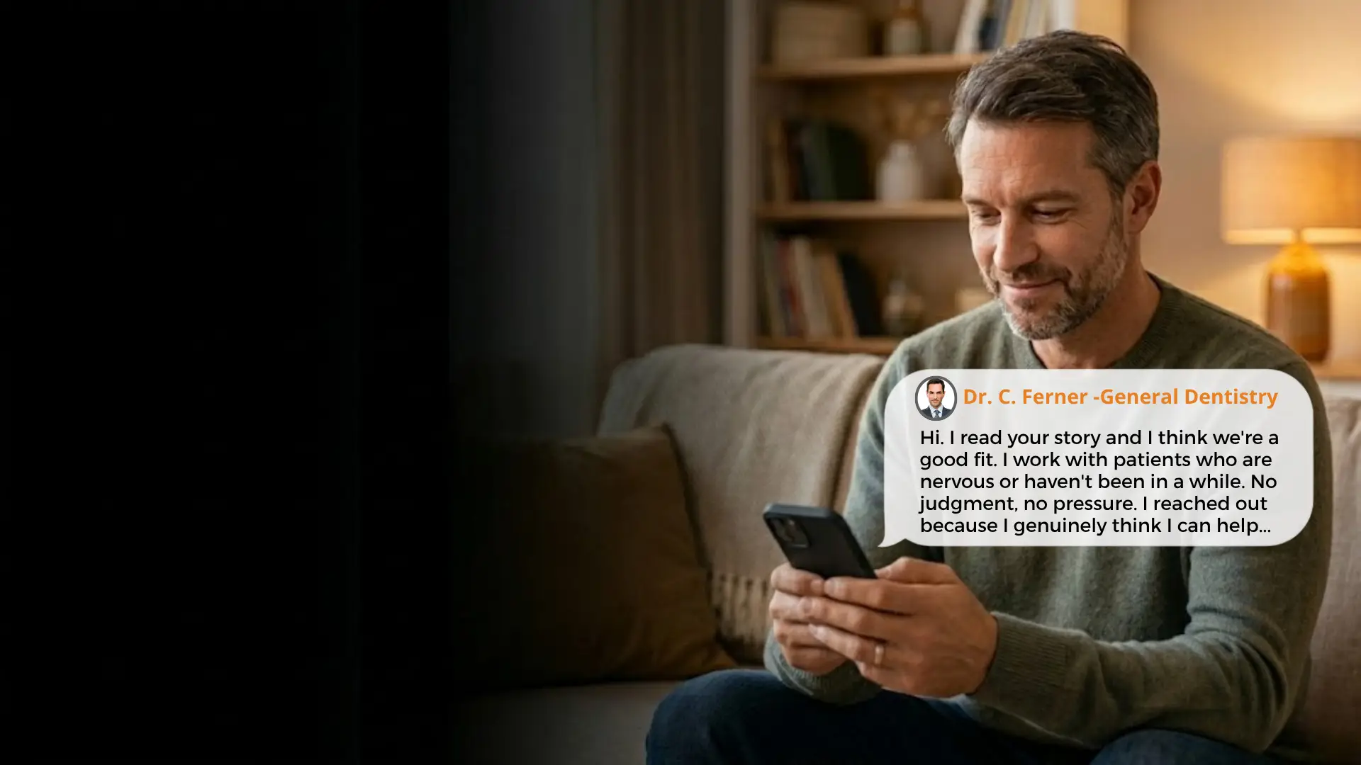 Say the thing you’ve never said to a dentist. Your real fear. Your financial situation. How long it’s really been. Nobody knows who you are yet — and a dentist responds only if they know they can help.