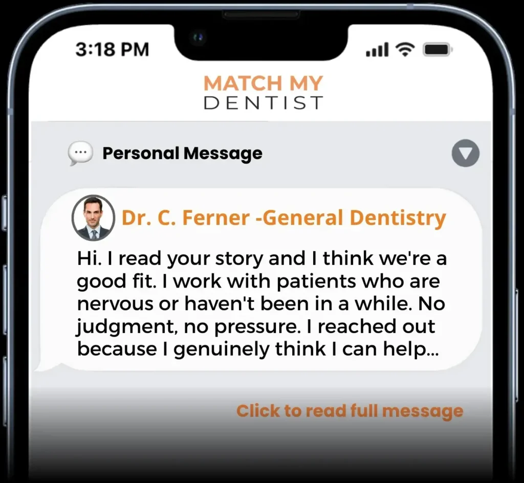 A dentist reads your full profile — your fear of needles, your last bad experience, your dental needs and priorities — and only reaches out if they know they can help. No cold calls. No pressure. Just one private message from someone who chose you and already knows your situation.